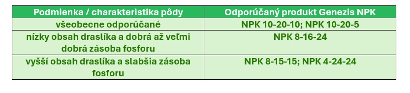 Popri hnojive Genezis NPK 10-20-10, ktoré okrem základných živín obsahuje aj pre pšenicu dôležité, druhovo špecifické prvky – vápnik, horčík a síru – v množstve desiatok kilogramov na hektár, sa ako osvedčený univerzálny produkt odporúča aj Genezis NPK 10-20-5, vhodný najmä pre pôdy s dobrou zásobou draslíka a s maximálne hlinitopiesočnatou až hlinito-ílovitou textúrou. Základné hnojenie je potrebné prispôsobiť zásobenosti pôdy živinami, predovšetkým fosforom a draslíkom (PK). Pre pôdy chudobné na draslík sa odporúča použitie Genezis NPK 8-16-24, zatým čo na pozemkoch, kde je zásobenost pôdy fosforom a draslíkom približne rovnaká a ich doplnenie je potrebné v rovnakom pomere, je vhodné aplikovať Genezis NPK 8-15-15 alebo Genezis NPK 4-24-24 (pozri tabuľku 1).
